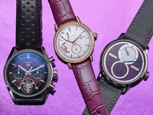 Purple watches by Vacheron Constantin, TAG Heuer, and Louis Erard x Kudoke.