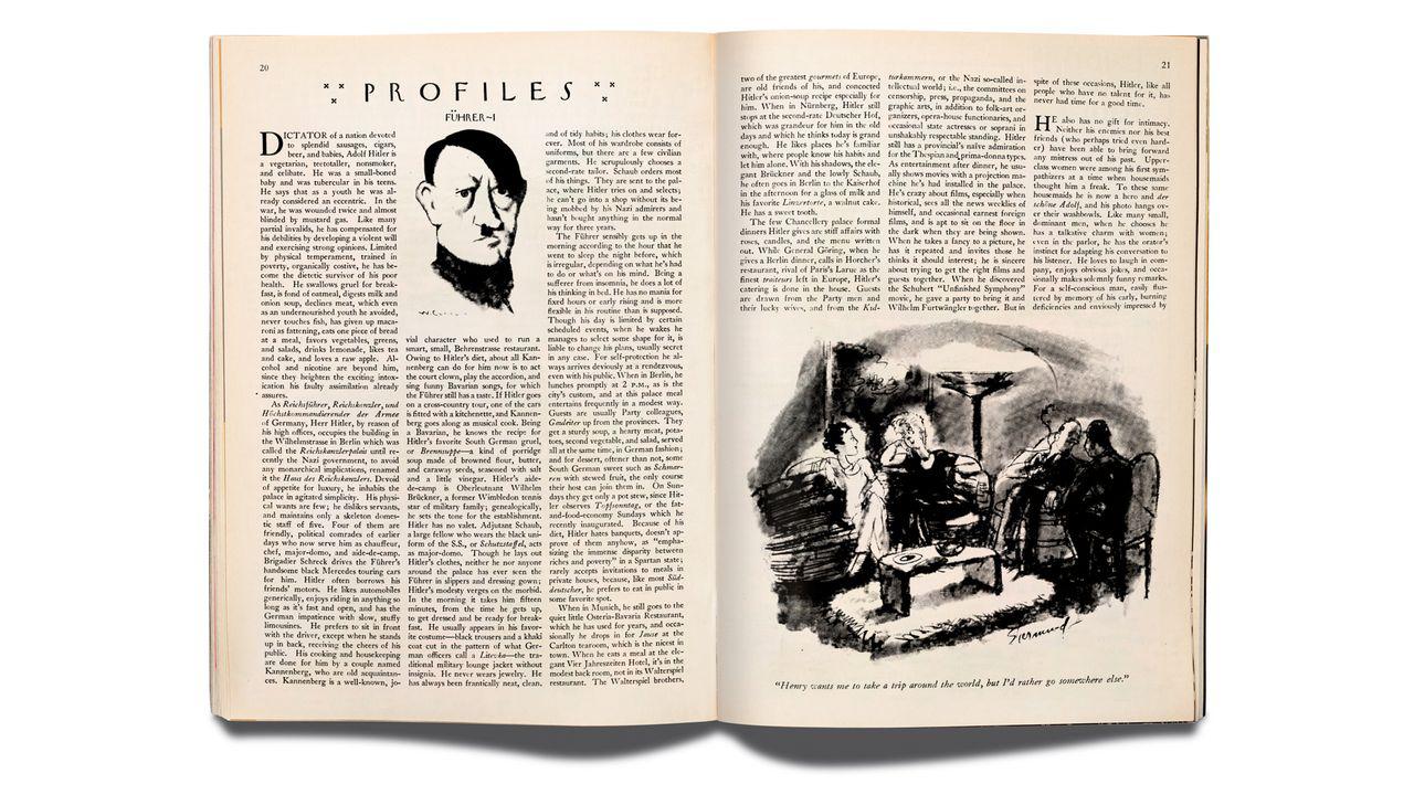 In early 1936, she published her weightiest piece yet—a three-part Profile of Adolf Hitler. This one, too, was a write-around: unlike Dorothy Thompson, an American journalist who had interviewed Hitler for Cosmopolitan (and whose unflattering portrayal got her kicked out of Germany), Flanner never secured an interview with the Führer, and it’s not clear how hard she pushed for one. She was neither an antifascist, like her friend Dorothy Parker, nor a Fascist, like her friend Ezra Pound; she was against crude bigotry, but she was not the world’s greatest philo-Semite. (In a letter to her mother, she once denigrated the writer Rebecca West as “a little Jewish.”) “Dictator of a nation devoted to splendid sausages, cigars, beer, and babies, Adolf Hitler is a vegetarian, teetotaller, nonsmoker, and celibate,” the first sentence of the Profile read. She had him pegged as a strange little man, teeming with contradictions—true, but hardly the most salient of his known flaws, even then.