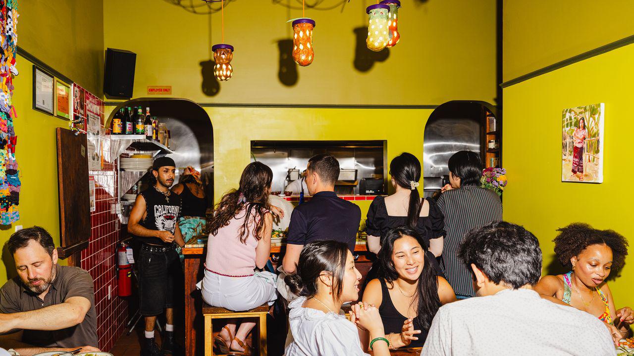 Almost everything on the menu is thrilling. Even what fails to be thrilling, such as a fairly floppy green salad that I tried on one visit, manages to be at least interesting. (The dressing on that salad was afire with Kampot peppercorns, a hard-to-find Cambodian variety that has a tealike flowery astringence.) Another salad of chewy-crisp pork jowl and sliced melon is zingy with garlic and pickle-tart. The round sweetness of squid, fried in a light-as-air batter, is magnified by intensely floral curry leaves and a salty snowfall of shaved cured egg yolk. A bone-in pork chop, thick as a dictionary, tender as can be, and drowning in a luscious mess of charred tomatoes marinated in a sugar-lime-fish-sauce concoction, features every shade of sour and sweet.