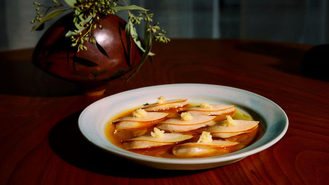 The dishes are simply beautiful. I nearly didn’t order a salad of golden beets with smoked yogurt, struggling to muster enthusiasm for yet another beet-and-dairy salad, but my dining companion insisted. It turned out to be amazing, a parade of roots in every shade of yellow, with bursts of brightness from what seemed like a whole bouquet of nasturtiums, orange and vermillion and gloaming purple. For all the complexity of McGarry’s creations, they remain tight and streamlined: every element is load-bearing, and the final appearance isn’t always showy. Take, for example, a bowl of artichoke purée poured around a hillock of tender Jonah crab. The smooth liquid is briny and delicate, with a subtle vegetality that harmonizes with the crustacean’s sweetness; an accompanying hunk of freshly baked bread provides a sour-edged counterpoint, enlivening things even more. For all the evident care in this dish, its plating is boldly plain—beige on beige. McGarry could easily have zhuzhed things up with a little color: a sprinkle of sumac, or a chiffonade of fresh mint, but adding any other element would have changed the flavor. He trusts, wisely, in the carefully calibrated balance of each bite.