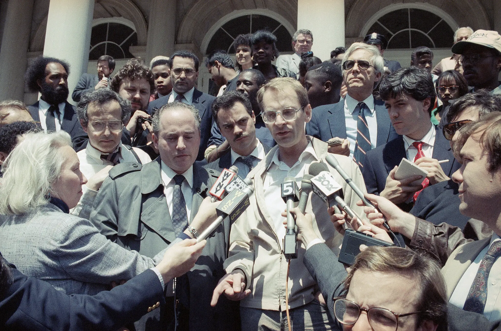 Bernie Goetz speaks to reporters on the steps of City Hall in New York in May 1990.