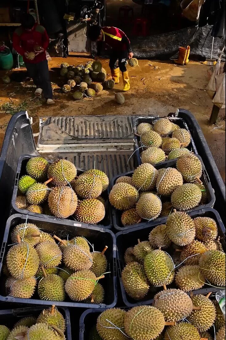 Staff loading sorted durians into the back of a truck in Raub, Malaysia, in January.