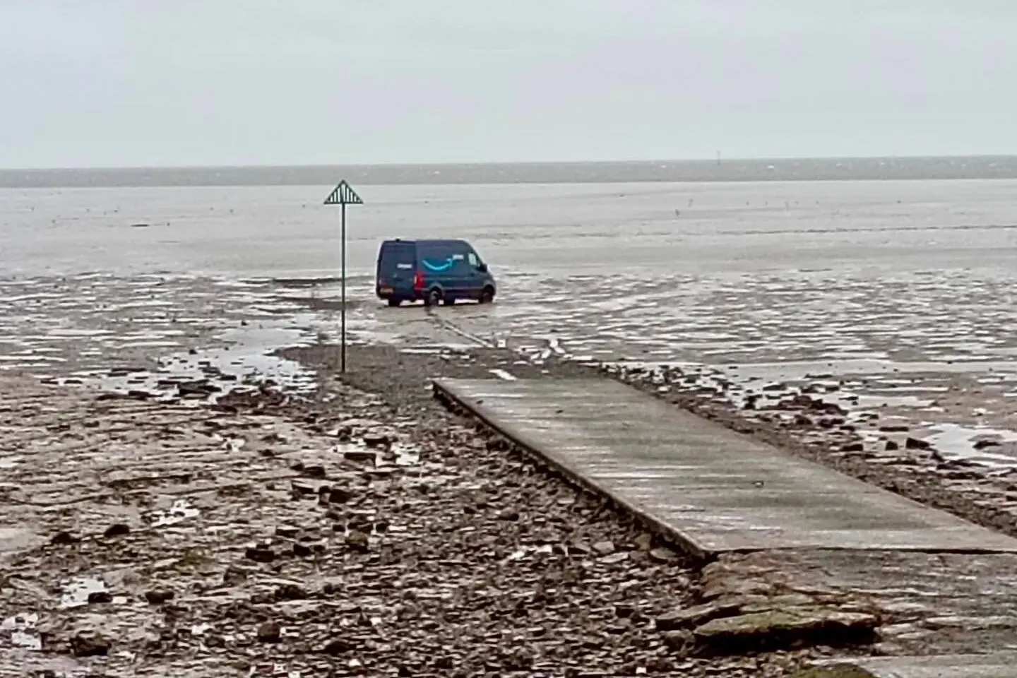 An Amazon delivery van was stranded on Sunday after its driver mistakenly steered onto the Broomway, a six-mile path out into the Thames Estuary in England.