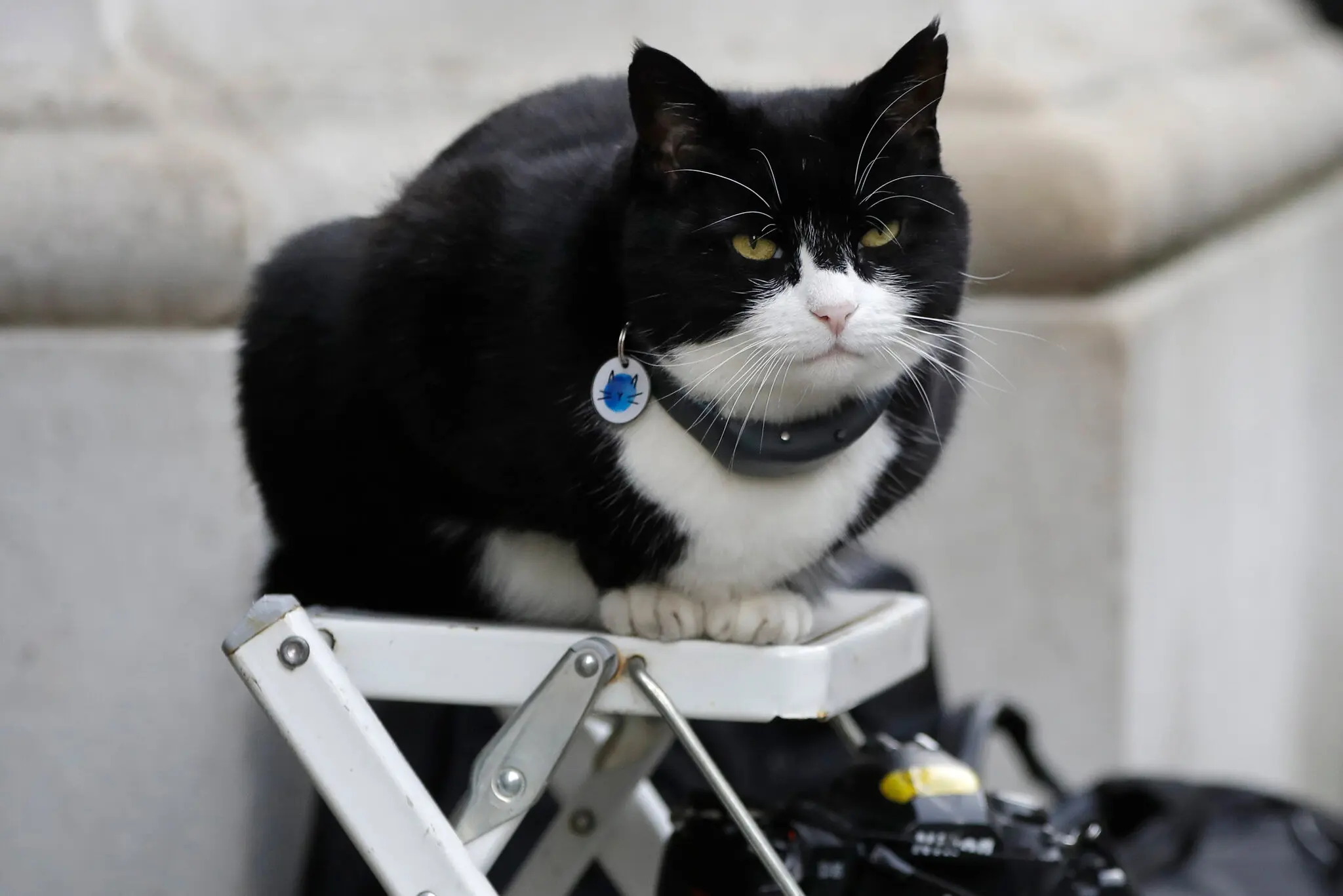 Palmerston sitting on a photographer’s ladder at Downing Street in London, in 2019.