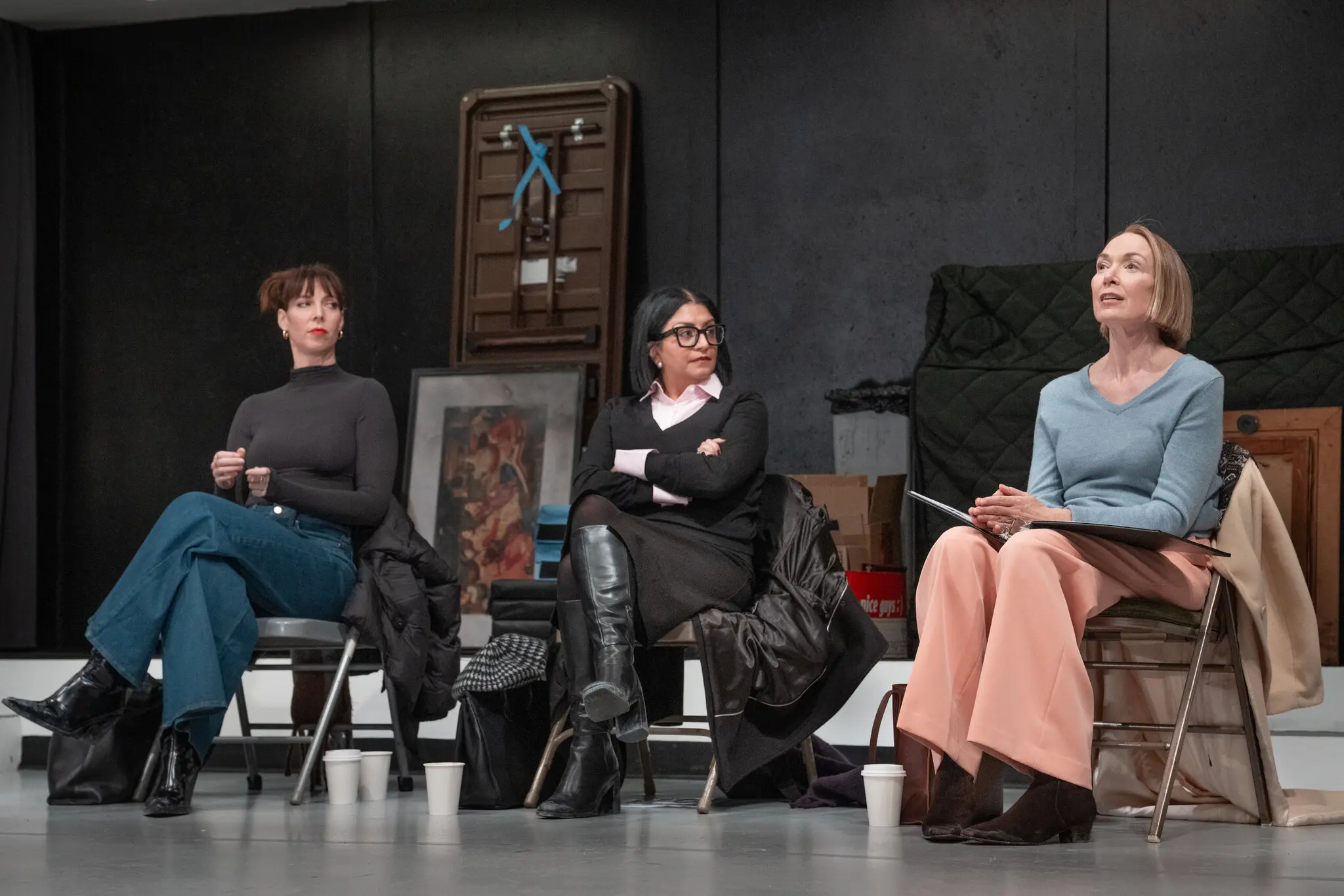 Early in the show, the set’s featureless space is assembled by the actors, and a familiar room emerges: folding chairs arranged in a semicircle, pastries and boxed coffee to one side. (The dots collective handled the scenic design, which appears to have heavily relied on a trip to Lowe’s.) The small talk suggests people who have known one another for a while and have a degree of intimacy.